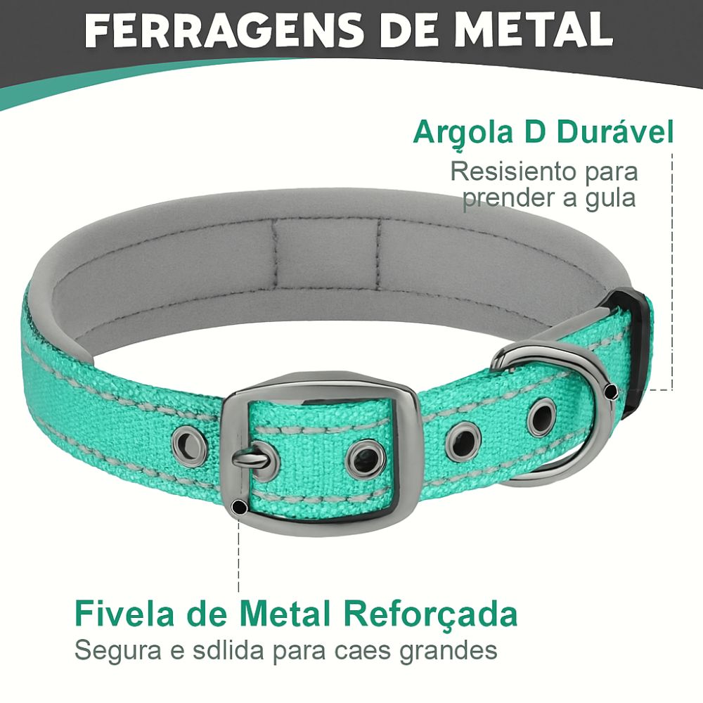 Segurança extra D-ring resistente para guia e argola exclusiva para plaquinha de identificação.
